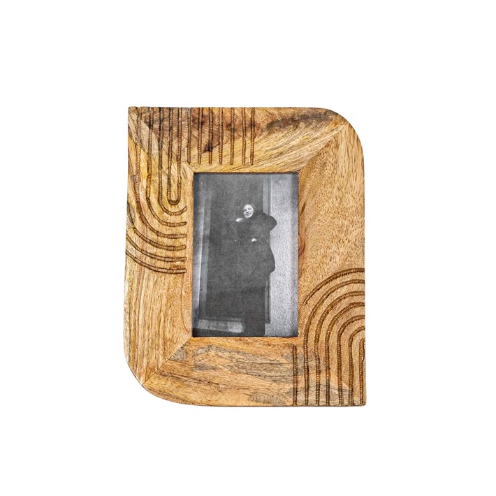 Description: This 4x6 picture frame is not just a simple way to display your favorite memories, but also a statement piece that adds character to any room. The combination of curved and straight edges creates a dynamic visual appeal, while the rainbow-inspired arch pattern adds a touch of whimsy. Crafted from sustainable natural wood, the warm tone of the frame complements a modern boho decor style effortlessly. Whether displayed on a wall, shelf, or mantel, this frame is sure to bring a pop of texture and charm to your space.