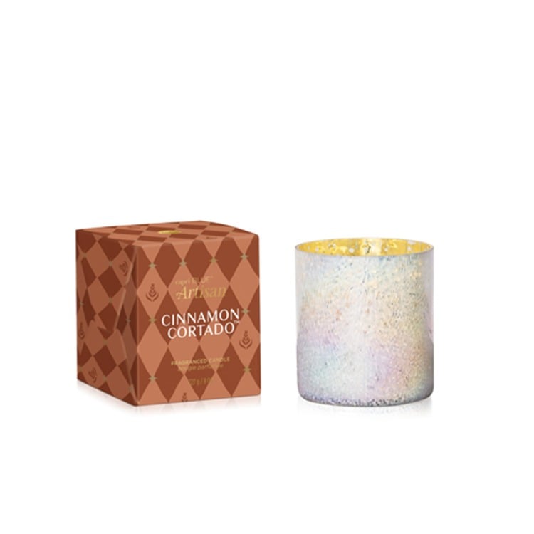 Elevate your space with this Capri Blue Cinnamon Cortado candle. Its deliciously warm cinnamon aroma blends perfectly with sweet undertones, creating a cozy ambiance that feels inviting and comforting. The artisan-inspired glass holder shimmers with elegant iridescence, making it a beautiful decor piece even when not lit. Perfect for unwinding after a long day or adding a welcoming touch to any room, this candle’s long-lasting fragrance and stunning presentation make every moment feel special. Imagine relaxing in its glow—pure bliss!