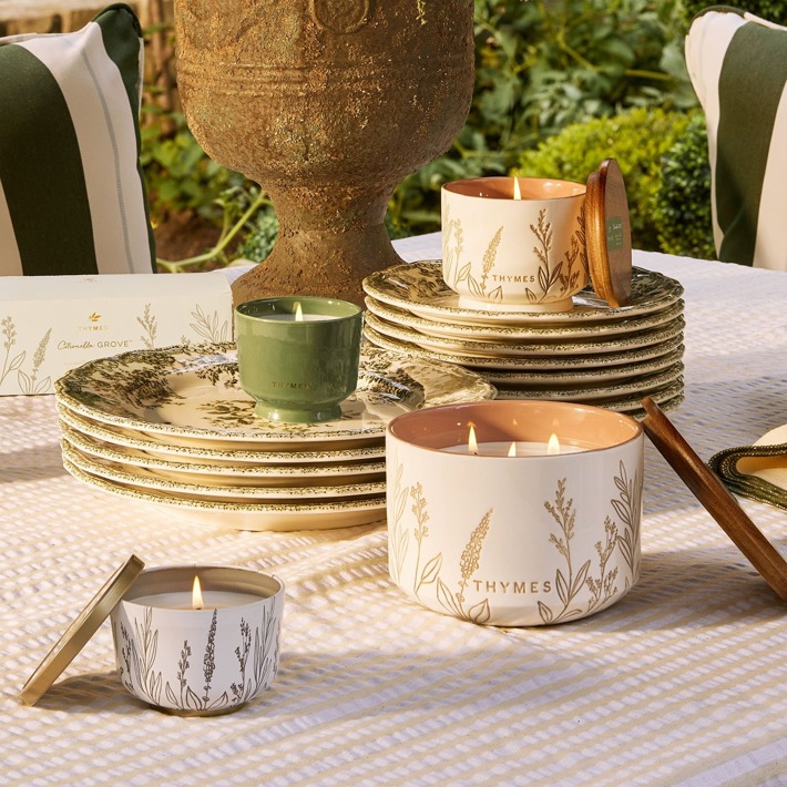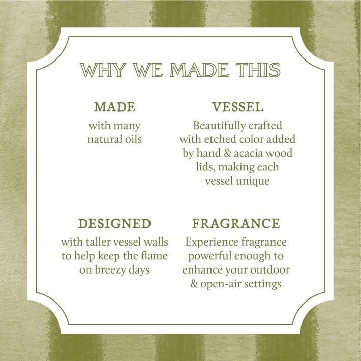 Description: Light outside and relish in the tranquility of your surroundings with refreshing notes of olive leaf, citronella, lemongrass, and gardenia paired with earthly notes of sage and cedarwood. A stunning centerpiece, this candle features hand drawn botanicals on the ceramic glazed vessel topped with a natural wood lid.