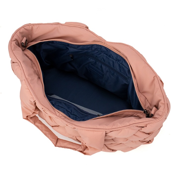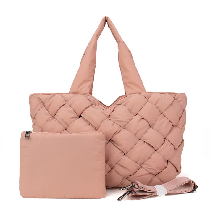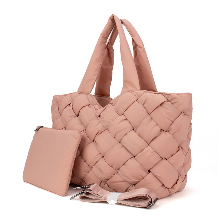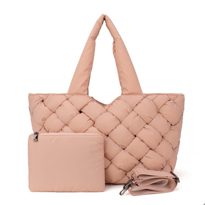 Description: Whether you're heading to the office, running errands, or jet-setting across the globe, this lightweight puffy woven tote is the perfect accessory to elevate your style. With its luxurious design and functional features, including a secure zipper closure, multiple pockets for organization, a dedicated cellphone pocket, a removable pouch, and a detachable crossbody strap for versatility, this tote is both practical and chic. The waterproof nylon lining adds durability, making it a reliable companion for any journey. Travel in style with this versatile and stylish tote that combines luxury and function seamlessly.