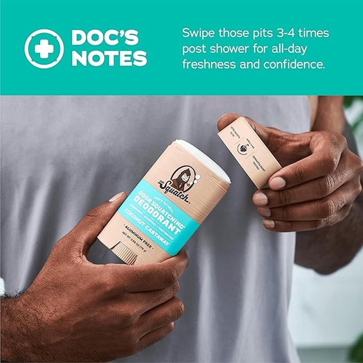 Description: Dr. Squatch natural mens deodorant is designed to keep you feeling fresh and confident all day long. Our Odor-Squatching system uses powerful natural deodorizers like charcoal powder, probiotics, and arrowroot powder to combat odor and absorb moisture. With a smooth glide application and skin-nourishing ingredients like jojoba and shea butter, our deodorant is gentle on your skin while keeping you smelling great. Say goodbye to B.O. and hello to all-day freshness with Dr. Squatch deodorant.