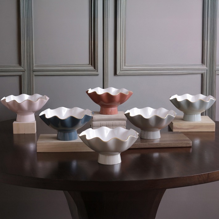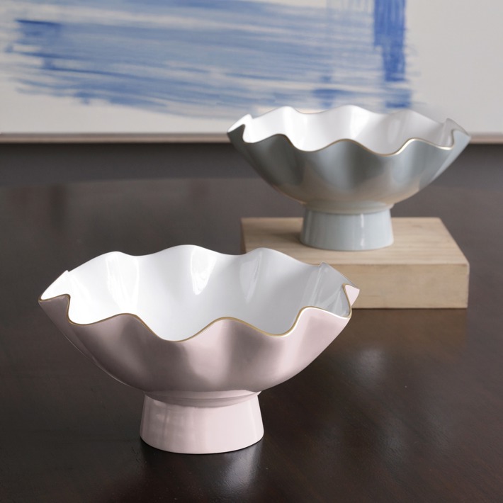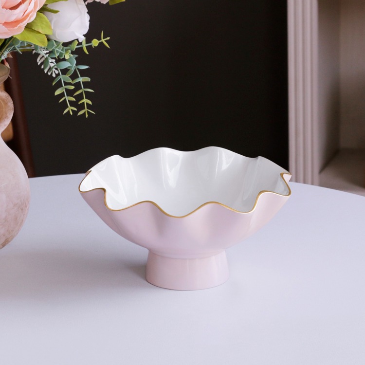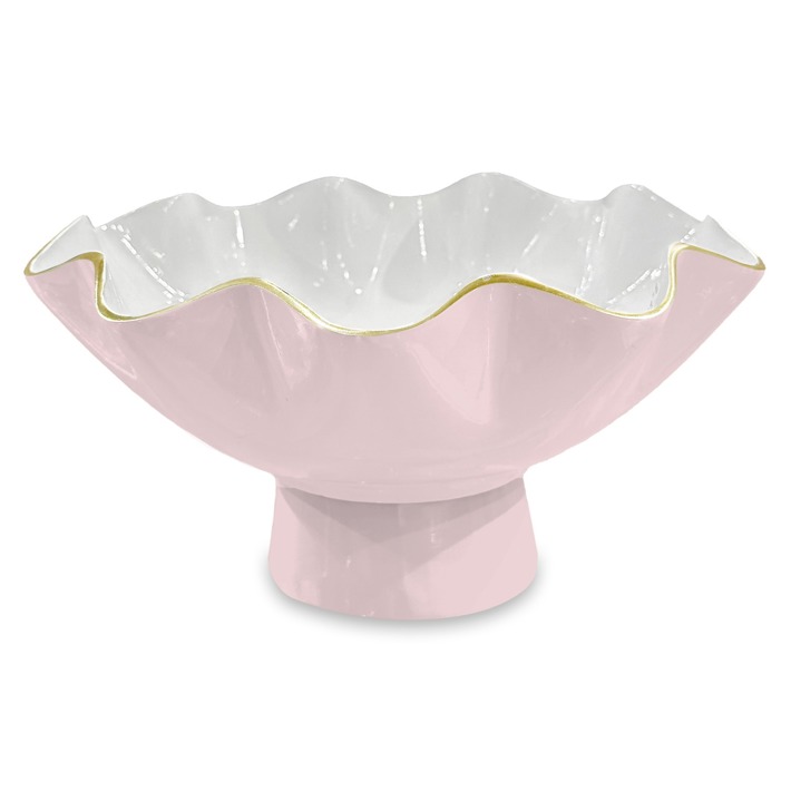 Fabulous design in a blush hue ... The Beatriz Ball ENCANTO Carola Small Pedestal (Camellia and White) elevates anything served on it. Rimmed in gold, its brilliant two-tone finish and flirty curves are a delight to the senses. “As delicate and pink as a camellia blossom, this blush hue is soft and soothing,” said Beatriz Ball of her latest bestselling color. Perched atop a base, the small pedestal bowl has a luxurious look and feel. Ideal for serving fresh fruit, it also makes a stunning accent piece. Beatriz Ball continues to innovate and add new finishes and techniques to her handmade offerings with the multicolored ENCANTO Collection--incorporating vibrant enameled colors and gold details. Created one at a time, during an intensely handmade process, molten aluminum alloy is poured into sand molds, and once hardened, is polished, painted and gilded. Crafted with meticulous care, more than 20-sets of artisan hands are involved in the creation of each ENCANTO piece. Layered, exuberant and rich in color, this beautiful assortment was designed with a versatility that ensures that every occasion is a celebration. Fashionably tailored in delightful colors, ENCANTO items are fabulous gift items for brides, and perfect for anyone who loves to entertain and decorate. On trend, their beautiful designs with curving forms add grace and sophistication to any setting. Beatriz Ball’s intensely handmade products use eco-friendly and sustainable materials and are crafted by artisans who trace a heritage of metalworking for generations. Made of a top quality, easy-care, aluminum alloy with a food safe enamel finish. Dishwasher safe.