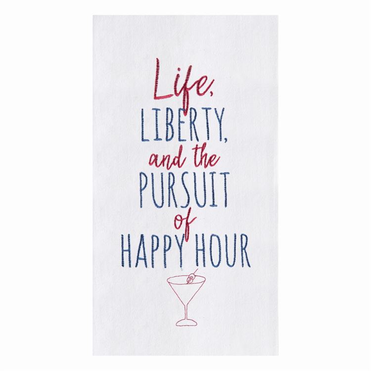 Description: Celebrate the pursuit of happiness with this charming flour sack towel, featuring a playful design that captures the essence of happy hour and American pride. Made of soft and absorbent cotton, this towel is not only a practical addition to any kitchen, but also a fun and festive decoration for Independence Day. Whether you're drying dishes or getting ready for a backyard BBQ, this towel is sure to bring a smile to your face and add a touch of patriotic flair to your home. Perfect for gifting or keeping for yourself, this towel is a must-have for anyone who loves to celebrate life, liberty, and the pursuit of happiness.