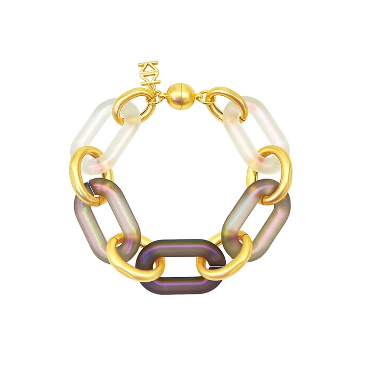 This magnetic closure bracelet features a unique design with alternating colorful resin and solid metal oval links. The vibrant resin links add a pop of color to the bracelet, while the metal links provide a sleek and modern contrast. The magnetic closure makes it easy to put on and take off, while ensuring a secure fit. This bracelet is perfect for adding a touch of fun and style to any outfit, whether you're dressing up for a special occasion or adding a pop of color to your everyday look.