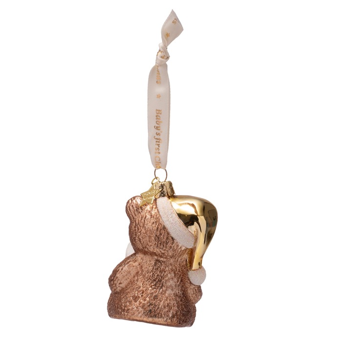 Celebrate life’s sweetest firsts with this adorable teddy bear ornament. Finished in a charming bronze shimmer and topped with a festive gold Santa hat, it’s designed to mark baby’s first Christmas in unforgettable style. The delicate ribbon and soft bow add a special touch, making it a beautiful keepsake parents will treasure year after year. Durable yet delightfully elegant, this ornament is perfect for creating heartfelt holiday memories and instantly brightening any tree with warmth, love, and a touch of magic.