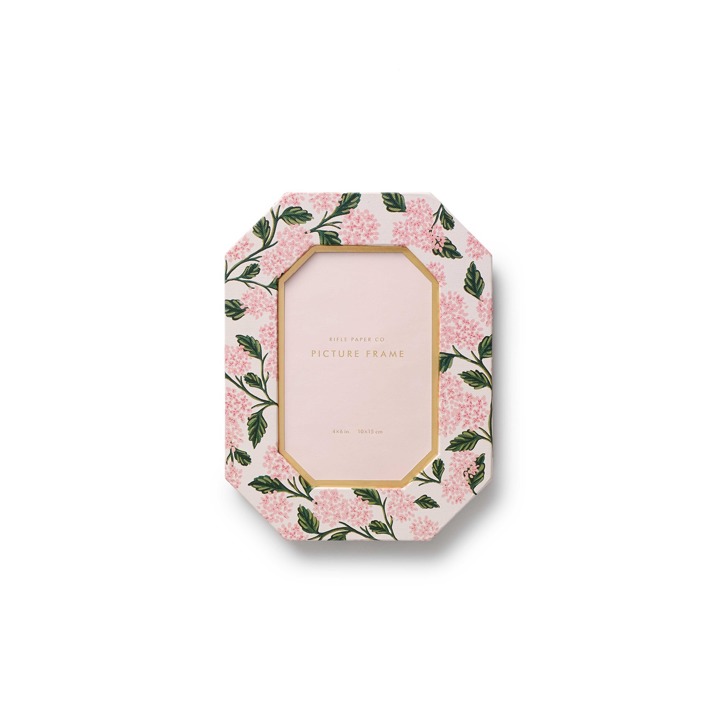 Description: Sized for a 4x6 photo, this octagonal, paper-wrapped frame features illustrated hydrangeas, a metallic gold photo mat, and a kickstand for display.