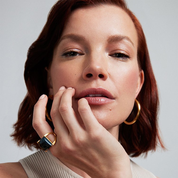 Description: Architectural lines punctuated by a substantial custom-cut gemstone