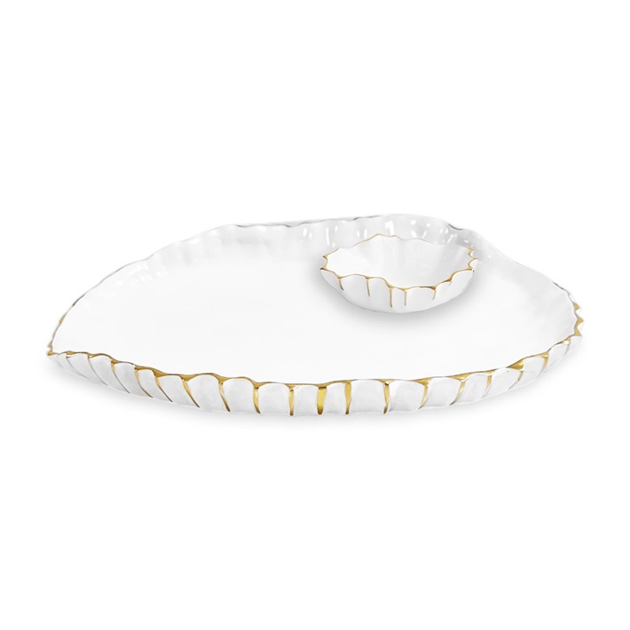 Description: Two pieces in one! Beatriz Ball continues her collaboration with Louisiana-based ceramicist Gretchen Murchison with the vibrant THANNI Mystic Collection. Inspired by natural forms, the THANNI Mystic Large Oval Platter with Mini Bowl (White and Gold) is rippling, flowing and organic. The dynamic two-piece design features a generous oval platter and a versatile small bowl, each with a serving area of white enamel that’s trimmed in a brilliant gold tone, creating a serving piece that combines beauty, artistry and functionality. This stylish piece is party ready, and is ideal for serving chips or veggies with dip. Fabulous gift item for brides, and perfect for anyone who loves to entertain or decorate. Totally on trend. Beatriz Ball’s intensely handmade products use eco-friendly and sustainable materials and are crafted by artisans who trace a heritage of metalworking for generations. Made of a top quality, easy-care, aluminum alloy with a food safe enamel finish. Dishwasher safe.