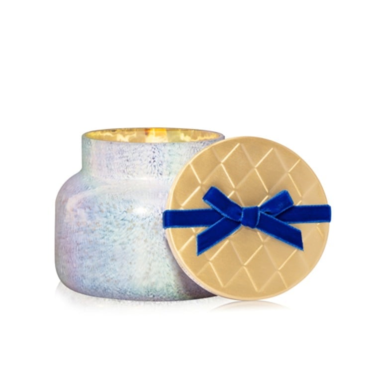 Bring a touch of luxury to any room with this shimmering candle, beautifully housed in an iridescent jar and topped with a quilted golden lid accented by a plush blue velvet bow. Its elegant design makes it a standout piece—perfect for gifting or adding a stylish sparkle to your own space. The warm glow and inviting fragrance instantly create a cozy, welcoming atmosphere, making your evenings feel extra special. Durable and decorative, this candle is a simple way to elevate your decor and transform everyday moments into something memorable.